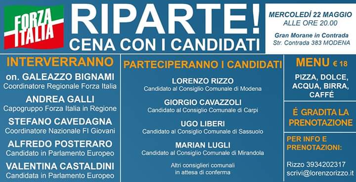 Senza categoria Vi aspettiamo il prossimo 22 maggio alla Pizzeria “GRAN MORANE” in Strada Contrada a Modena per ribadire che X il #CENTRODESTRA Forza Italia è indispensabile per governare nei comuni della Provincia di Modena Condividi: Condividi su X (Si apre in una nuova finestra) X Condividi su Facebook (Si apre in una nuova finestra) Facebook Mi piace Caricamento... Correlati