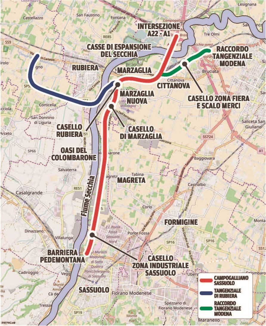 La bretella è considerata una delle tre opere strategiche per lo sviluppo della regione (le altre sono la Cispadana, per collegare Reggiolo, in provincia di Reggio Emilia, a Ferrara, e il Passante di Mezzo, per sgravare il nodo di Bologna). Prevede la realizzazione di un asse autostradale principale tra i due comuni di Campogalliano e Sassuolo, tra la A22 e la statale 467, con due gallerie artificiali, otto viadotti e cinque svincoli. Un tracciato di 14,8 chilometri al quale vanno aggiunti l’asse di collegamento con la tangenziale di Modena (3,6 chilometri), il collegamento con la A22 (1,4) e la variante alla via Emilia (6,5) in corrispondenza di Rubiera.