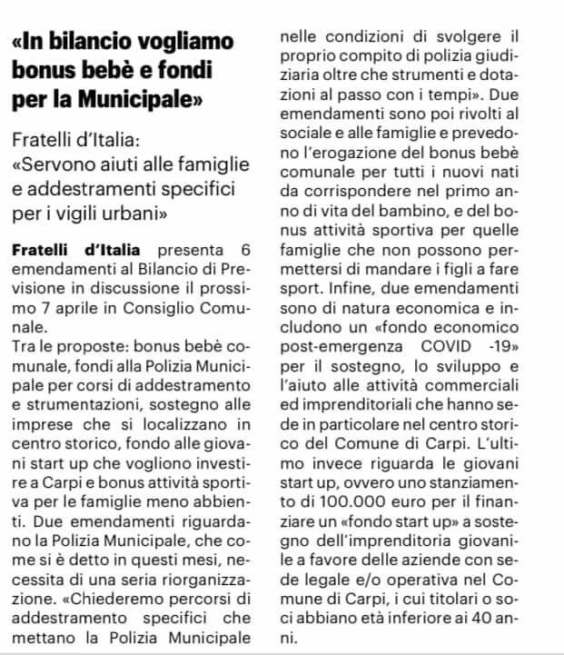 Rassegna stampa di Gazzetta di Modena e Il Resto del Carlino dove si parla dei 6 emendamenti presentati da Fratelli d’Italia al Bilancio di previsione in discussione in Consiglio Martedì 7: SICUREZZA, SOCIALE ed AIUTI ECONOMICI