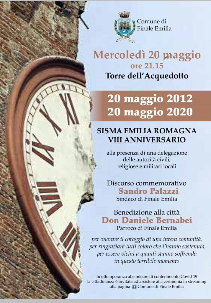 ULTIMA ORA Per non dimenticare ‼️alle 21,15 a.Finale.Emilia alle 21,15 sotto la Torre dell’acquedotto, commemorazione e ricordo ad otto anni dal SiSma 2012 VI ASPETTIAMO ❗ P.s. Manifestazioni organizzta con tutte le regole e precauzioni in vigore Condividi: Condividi su X (Si apre in una nuova finestra) X Condividi su Facebook (Si apre in una nuova finestra) Facebook Mi piace Caricamento... Correlati