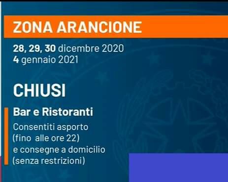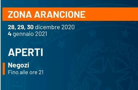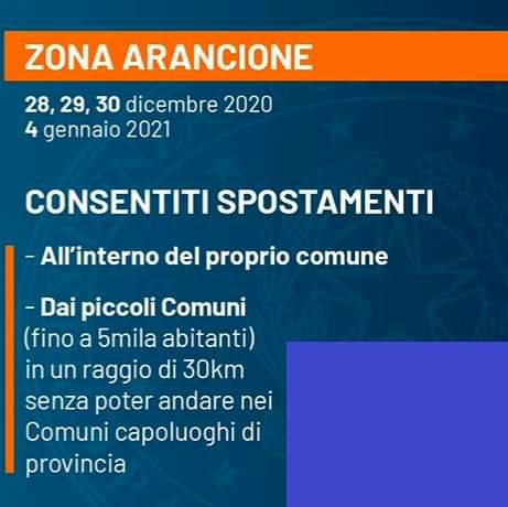 🟠 Nei giorni 28, 29 e 30 dicembre 2020, e nel giorno 4 gennaio 2021, in tutta Italia saranno in vigore le regole relative alla «zona arancione» (si potrà uscire da un Comune se la popolazione non supera i 5.000 abitanti e se il Comune dove ci si vuole spostare non è più lontano di 30 chilometri. Resta vietato in ogni caso uscire dal proprio Comune se ci si vuole recare nel capoluogo di provincia.)
