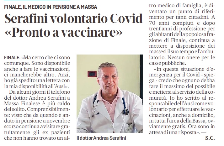 ALTRA NOTIZIA IMPORTANTE : IL DR. SERAFINI, IN PENSIONE DA OTTOBRE 2020, ASSISTE TANTI CITTADINI DI MASSA FINALESE E DI FINALE EMILIA, IN ATTESA CHE LA “BUROCRAZIA” DELL’AUSL DECIDA COME SOSTITUIRLO…. UN VERO ESEMPIO DI SERVIZIO E DI VOLONTARIATO IN QUESTO PERIODO DI COVID 19!!