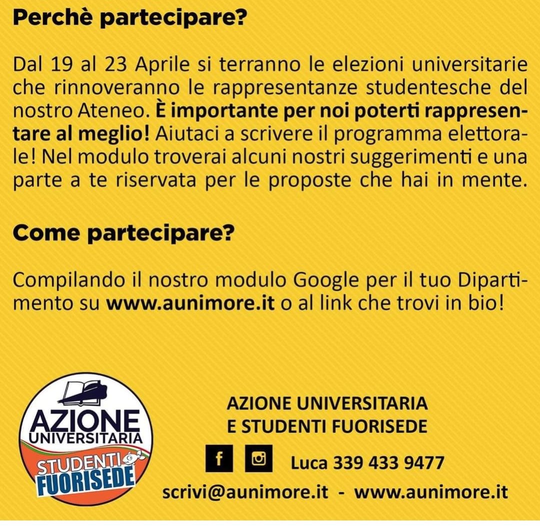 Le ragazze ed i ragazzi nelle liste di Azione Universitaria-Studenti Fuori Sede sono determinati e coesi per salvaguardare gl’interessi degli studenti con attenzione massima per ognuno dei frequentatori dei vari atenei delle università, in particolare all’Università di Modena e Reggio saranno presenti con liste qualificate in ogni facoltà ‼️