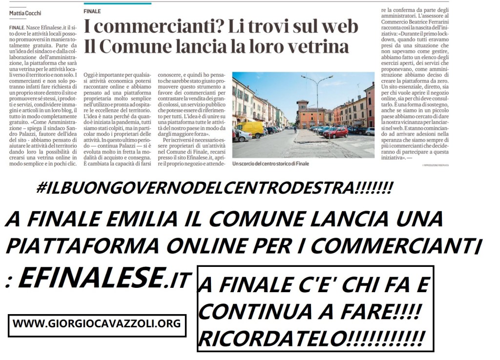 ASSOCIAZIONE LIBERTA' E SICUREZZA, FINALE EMILIA NEL CUORE, PARLO DI ME, UCMAN, ULTIMA ORA NASCE LA PIATTAFORMA ON-LINE PER I COMMERCIANTI DI FINALE EMILIA!!!!! #ILBUONGOVERNODELCENTRODESTRA CLICCA QUI SOTTO E SEGUI IL VIDEO DI SPIEGAZIONE DELLA PIATTAFORMA DEL SINDACO SANDRO PALAZZI https://fb.watch/4_seoFPALZ/ Condividi: Condividi su X (Si apre in una nuova finestra) X Condividi su Facebook (Si apre in una nuova finestra) Facebook Mi piace Caricamento... Correlati