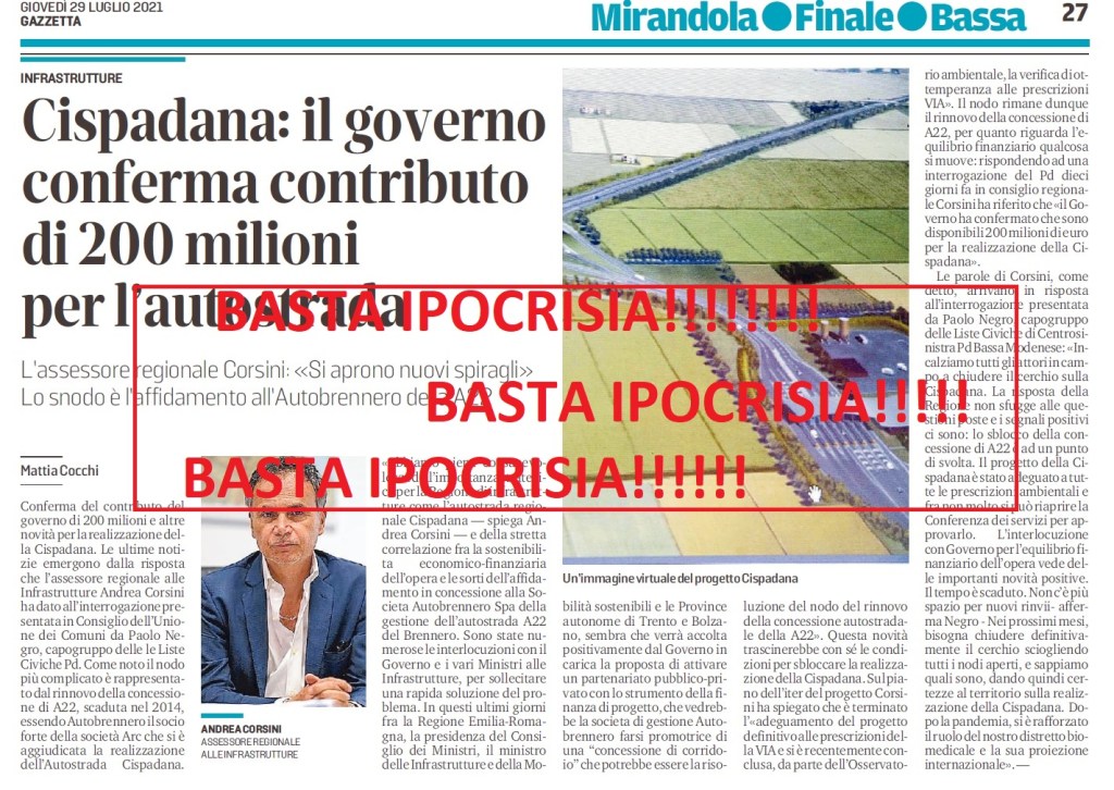 Carissime cittadine e carissimi cittadini di FINALE EMILIA – MASSA FINALESE – FRAZIONI, la nostra proposta di partire con la strada a SCORRIMENTO VELOCE rimane l’unica “strada” per evitare ulteriori PROMESSE e pastoie burocratiche da parte dei soliti “sinistri” i quali, dovendo difendere l’indifendibile, oggi affermano di avere i finanziamenti governativi…… MA PRIMA NON C’ERANO? PERCHE????? CHI GOVERNA DAL 2011????