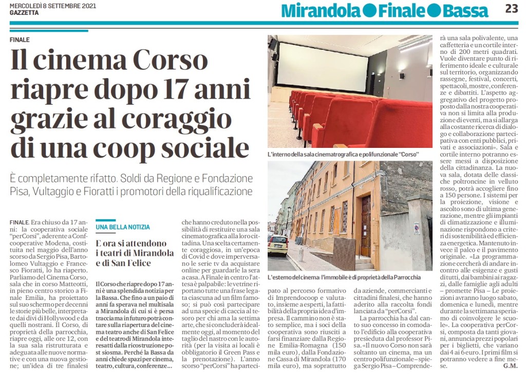 Il Corso, di proprietà della parrocchia, riapre oggi, alle ore 12, con la sua sala ristrutturata e adeguata alle nuove normative e con una nuova gestione; un’ idea di tre finalesi che hanno creduto nella possibilità di restituire una sala cinematografica alla loro cittadina. Una scelta certamente coraggiosa, in un’ epoca di Covid e dove imperversano le serie tv da acquistare online per guardarle la sera a casa. A Finale in centro l’ attesa è palpabile: le vetrine riportano tutte una frase legata ciascuna ad un film famoso; si può così partecipare ad una specie di caccia al tesoro per chi ama la settima arte, che si concluderà idealmente oggi, al momento del taglio del nastro con le autorità (per la visita ai locali è obbligatorio il Green Pass e la prenotazione). L’ anno scorso “perCorsi” ha partecipato al percorso formativo di ImprendoCoop e valutato, insieme a esperti, la fattibilità della propria idea d’ impresa. Il cammino non è stato semplice, ma i soci della cooperativa sono riusciti a farsi finanziare dalla Regione Emilia-Romagna (150 mila euro), dalla Fondazione Cassa di Mirandola (170 mila euro), ma soprattutto da aziende, commercianti e cittadini finalesi, che hanno aderito alla raccolta fondi lanciata da “perCorsi”.