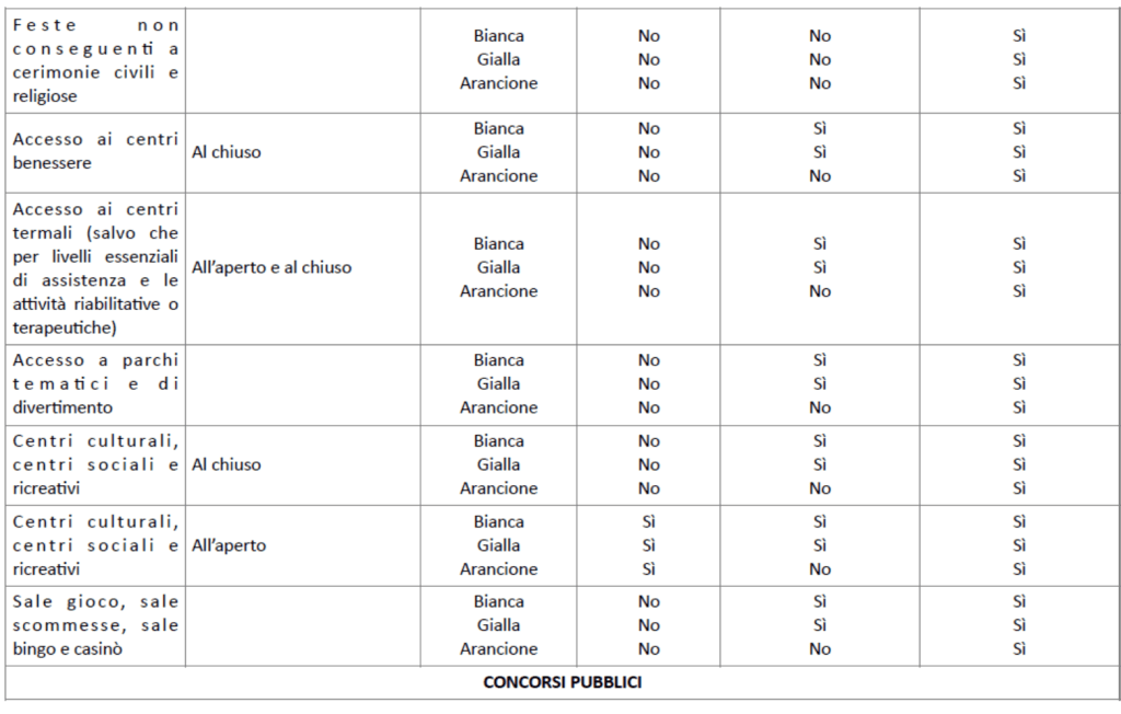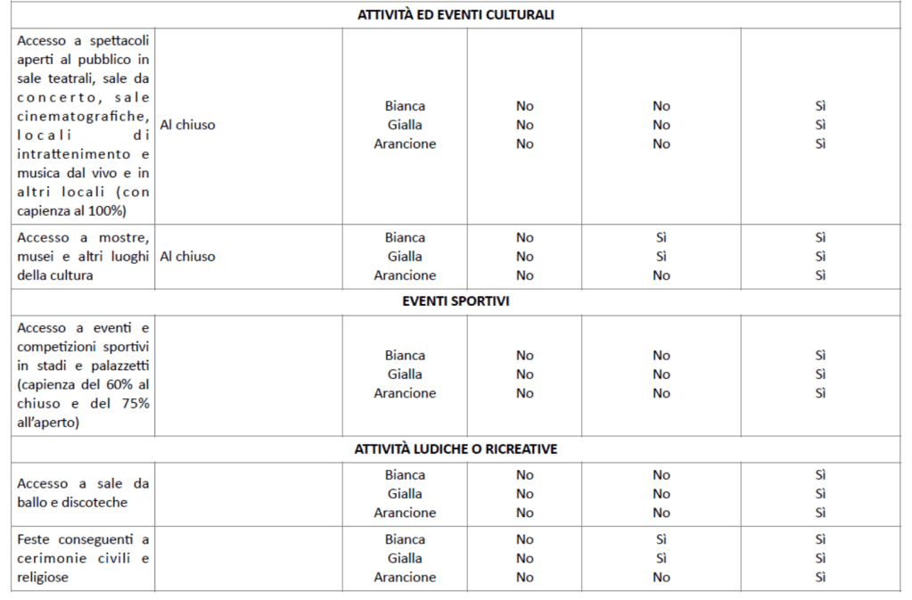 L’accesso alle discoteche è consentito solo con il Super Green Pass mentre per prendere parte alle cerimonie conseguenti a riti civili e religiosi basta la certificazione verde base, a meno che la regione non si trovi in Zona Arancione. In questo caso la partecipazione è consentita solo con il Super Green Pass.
