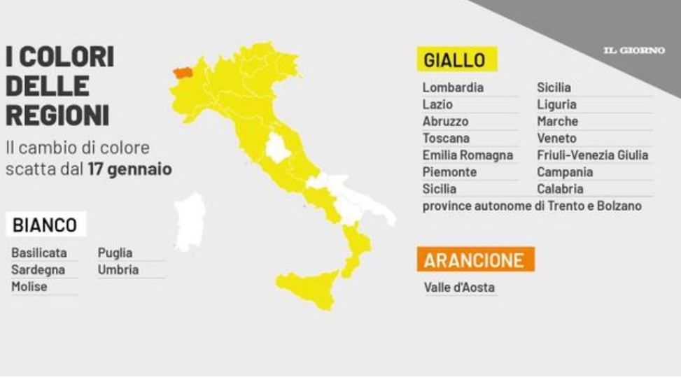 Campania in zona gialla e Valle d’Aosta in arancione da domani, lunedì 17 gennaio. Cambia ancora dunque la mappa dei colori in Italia, con la maggior parte delle regioni ormai in fascia gialla. Il ministro della Salute Roberto Speranza ha firmato l’ordinanza alla luce del flusso dei dati del monitoraggio di Istituto superiore di sanità (Iss), ministero della Salute e Regioni. La variante Omicron continua a correre e i contagi che non scendono sotto i 180mila. Secondo il bollettino diffuso ieri in 24 ore sono stati registrati 180.426 nuovi casi da Coronavirus in Italia e 308 morti.