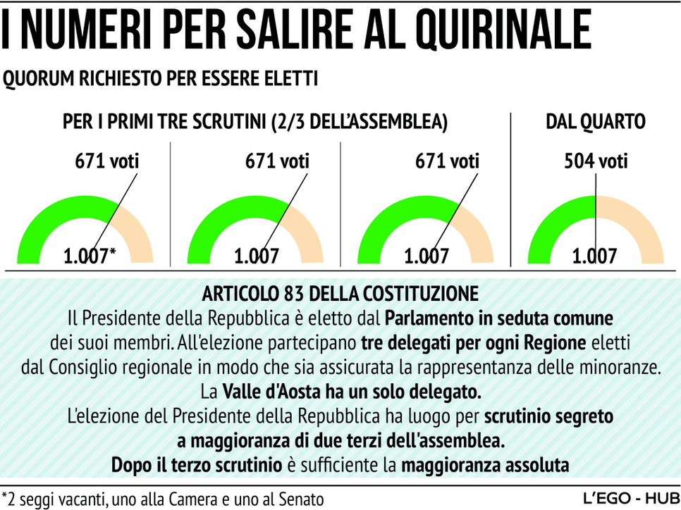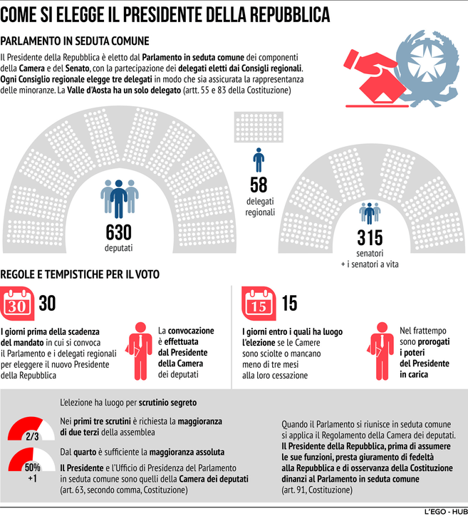 Il Capo dello Stato viene eletto dal Parlamento riunito in seduta comune con 58 rappresentanti delle Regioni. Nelle prime tre votazioni serve la maggioranza dei due terzi, poi basta quella assoluta.