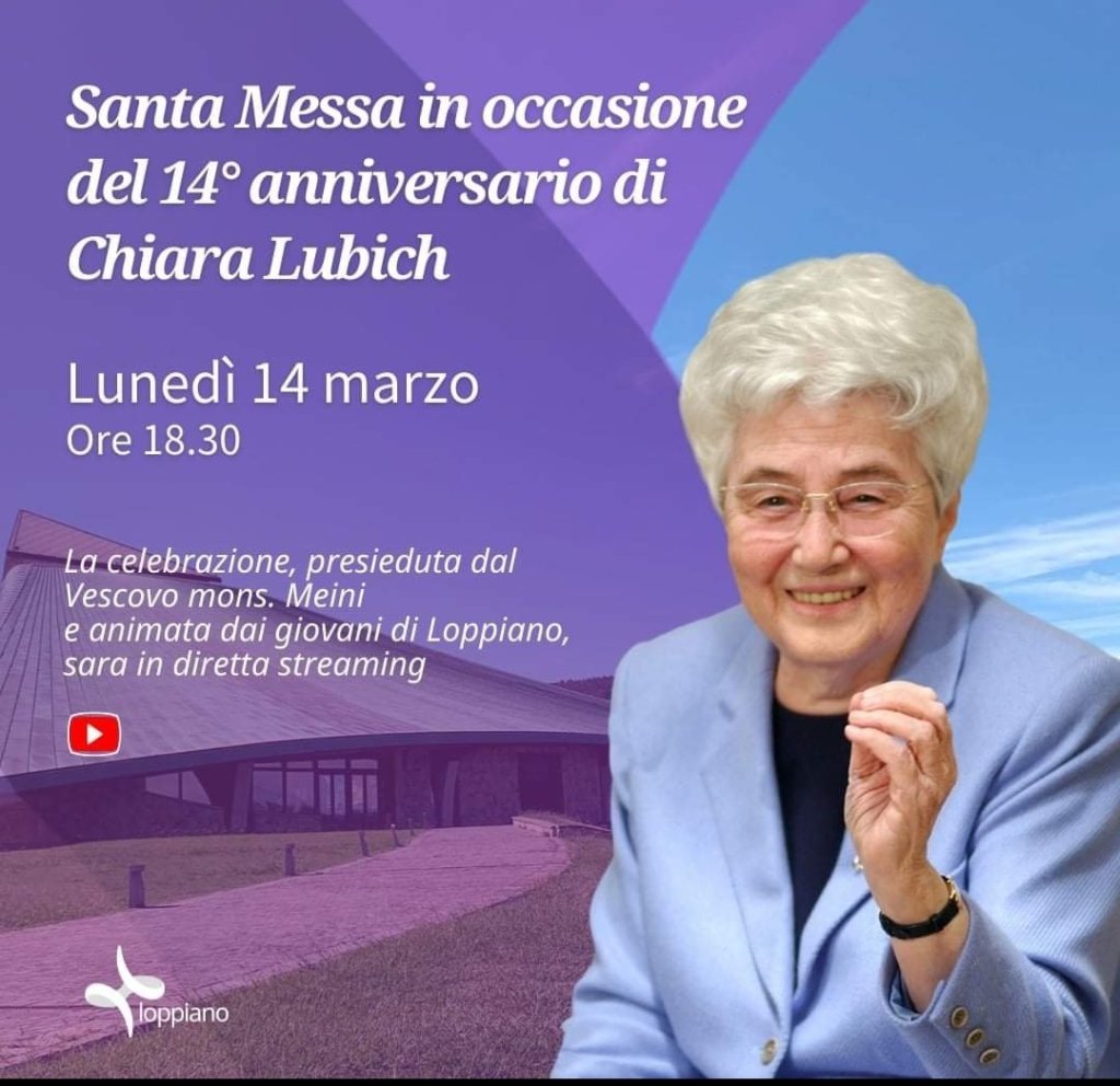 Lunedì 14 marzo, ricorre il 14° anniversario della morte di Chiara Lubich, fondatrice di #Loppiano. Per ricordarla, affidare anche a lei l’umanità e chiedere la #pace 🕊 , nel santuario Maria Theotokos, alle 18.30, sarà celebrata una messa presieduta dal Vescovo, mons. Meini e animata dai giovani della cittadella.
