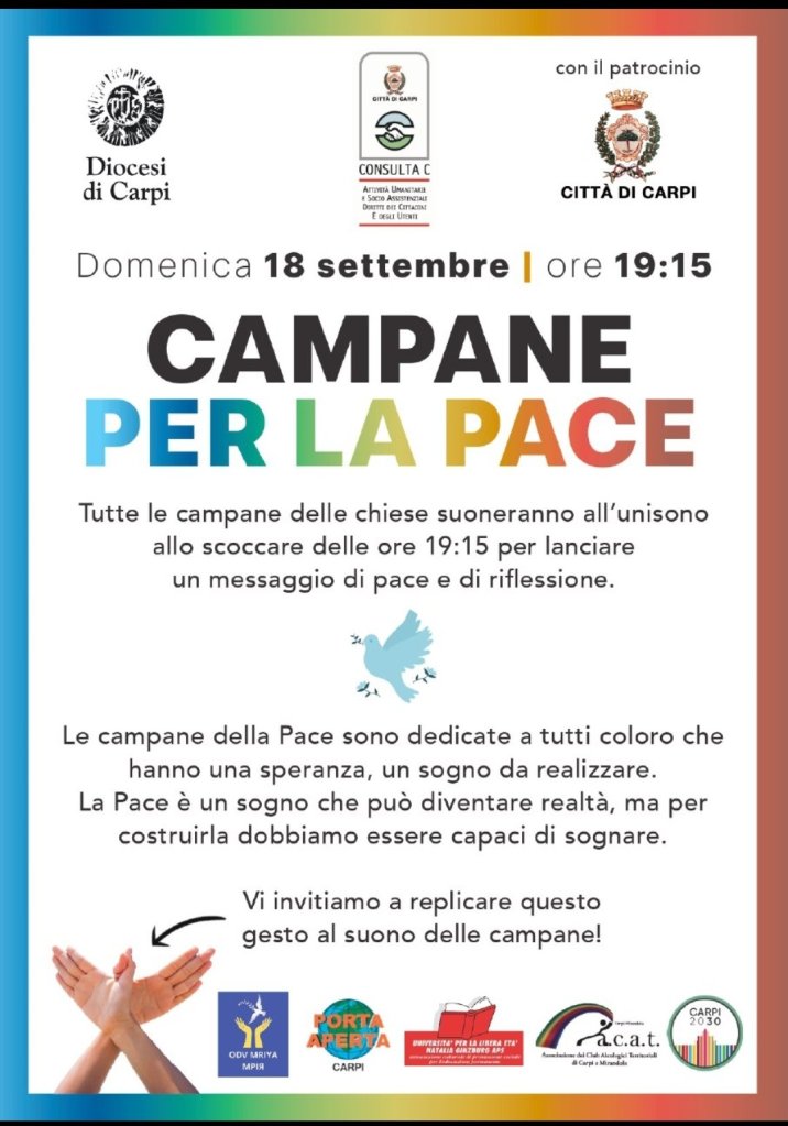 Domenica 18 settembre, al termine dell’iniziativa “Campane per la pace”, promossa dalla “Consulta C” del Comune di Carpi con altre istituzioni e realtà cittadine e del territorio, la Diocesi di Carpi organizza un evento speciale sul tema della pace.