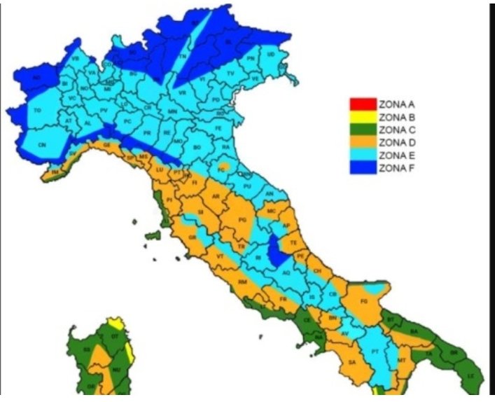 . Zona E (comprende diverse aree del Nord e città come Milano, Torino e Bologna): riscaldamento acceso 13 ore al giorno dal 22 ottobre al 7 aprile