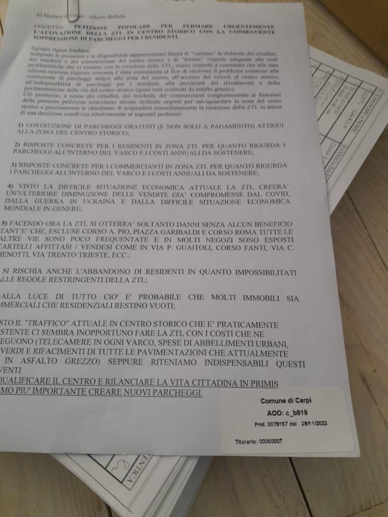 Oggi sono state depositate presso il Comune di Carpi, con tanto di PROTOCOLLO, nr. 2.500 firme raccolte da tante cittadine e cittadini della nostra città da maggio ad oggi CONTRO LA PROPOSTA DI ALLARGAMENTO DELLA Z.T.L. (zona a traffico limitato)
