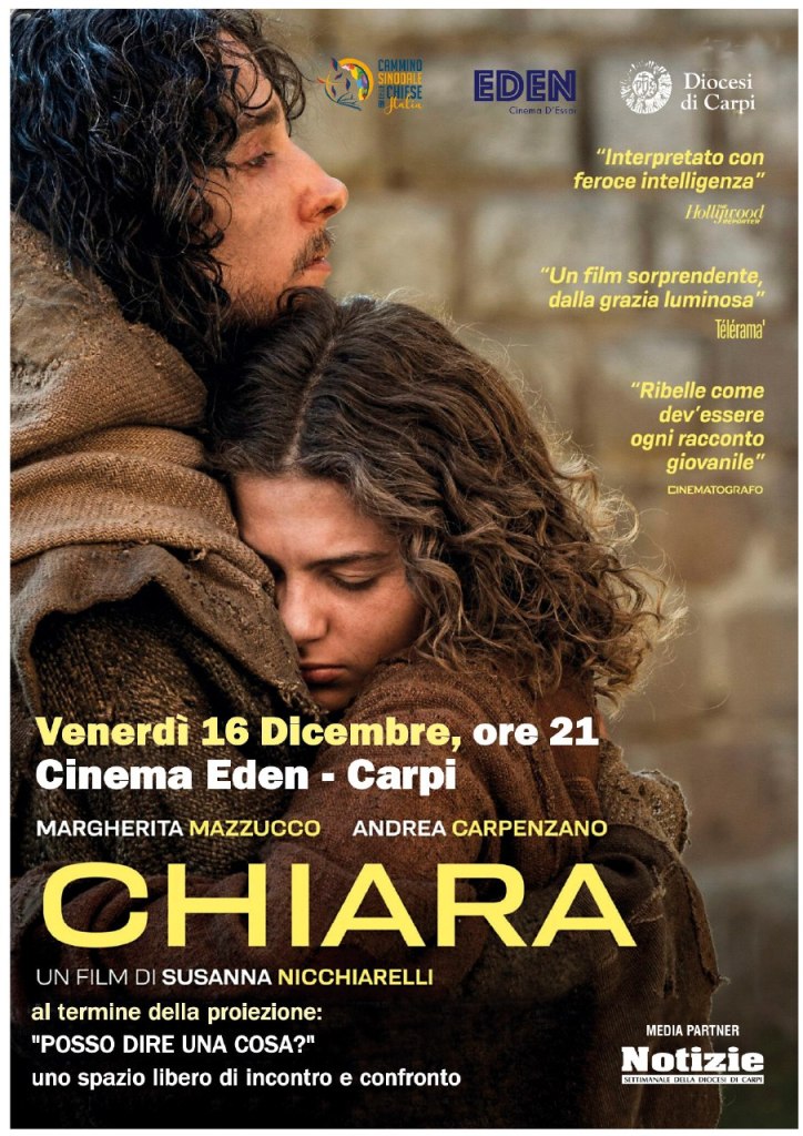 Venerdì 16 dicembre, alle ore 21, al Cinema Eden a Carpi, sarà proiettato il film “Chiara” di Susanna Nicchiarelli. Oltre alla presenza di ospiti in sala, al termine della proiezione è previsto lo spazio dal titolo “Posso dire una cosa?” come momento libero di incontro e di confronto fra gli spettatori. L’iniziativa è promossa dalla Diocesi di Carpi insieme al Cinema Eden.