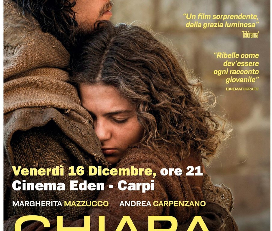 Venerdì 16 dicembre, alle ore 21, al Cinema Eden a Carpi, sarà proiettato il film “Chiara” di Susanna Nicchiarelli. Oltre alla presenza di ospiti in sala, al termine della proiezione è previsto lo spazio dal titolo “Posso dire una cosa?” come momento libero di incontro e di confronto fra gli spettatori. L’iniziativa è promossa dalla Diocesi di Carpi insieme al Cinema Eden.