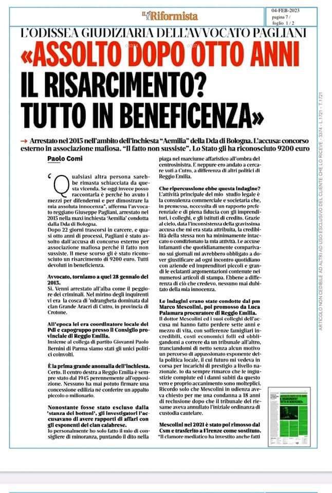 I guai di Pagliani cominciarono nel 2012, quando la Dda di Bologna documentò i suoi rapporti e i suoi incontri con esponenti di primissimo piano della cosca Grande Aracri, alcuni dei quali – come Nicolino Sarcone – già sotto processo per mafia. Arrestato il 28 gennaio 2015, fu assolto in primo grado e condannato a 4 anni in appello. Ma la Cassazione, accogliendo un ricorso della difesa, ordinò di rifare il processo, conclusosi poi con l’assoluzione.