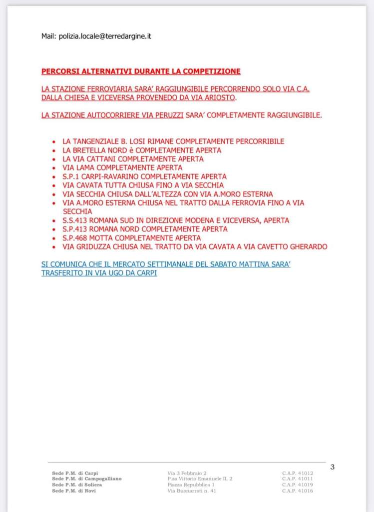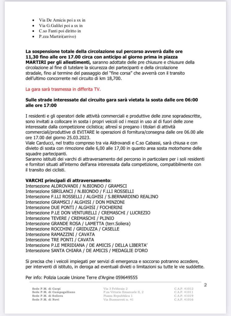- dalle ore 6:00 di sabato 25 marzo saranno chiuse al traffico e sarĂ vietata la sosta sulle strade del circuito