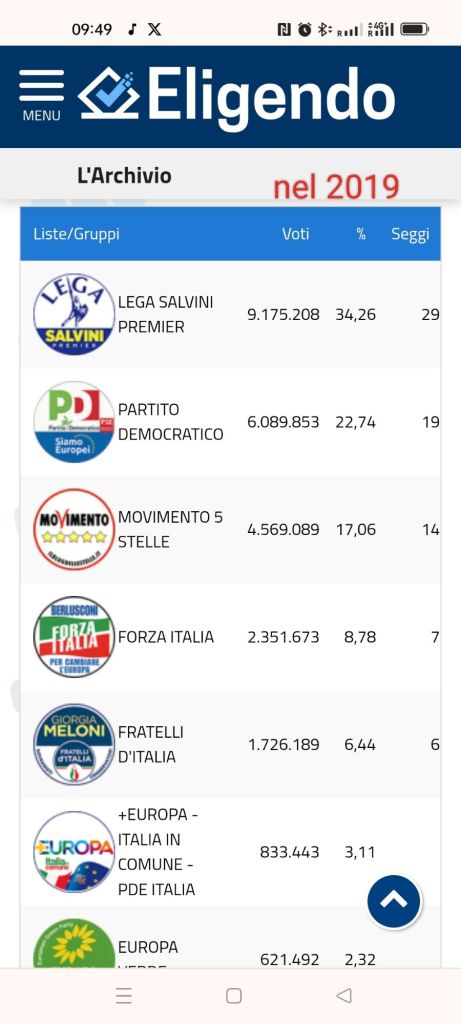 Nel 2019 il “messia” sembrava Salvini della Lega che era riuscito a trasformare un partito lombardo/veneto in una formazione conservatrice nazionale. La Lega in pochi anni dal suo rilancio supero’ il 34%.