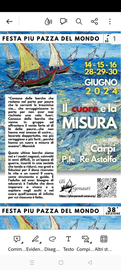 Queste ultime barche siamo noi e i nostri ragazzi, coinvolti in anni difficili, in un’epoca di guerre, inseriti in una società che tende a ridurci, ma grati e fiduciosi per il dono ricevuto: la vita e un cuore! Il cuore, come strumento e guida. È l’adulto ad aver bisogno di educarsi; è l’adulto che deve imparare a vivere e a ospitare negli occhi e nel cuore quell’oceano di infinito per cui ciascuno è fatto.