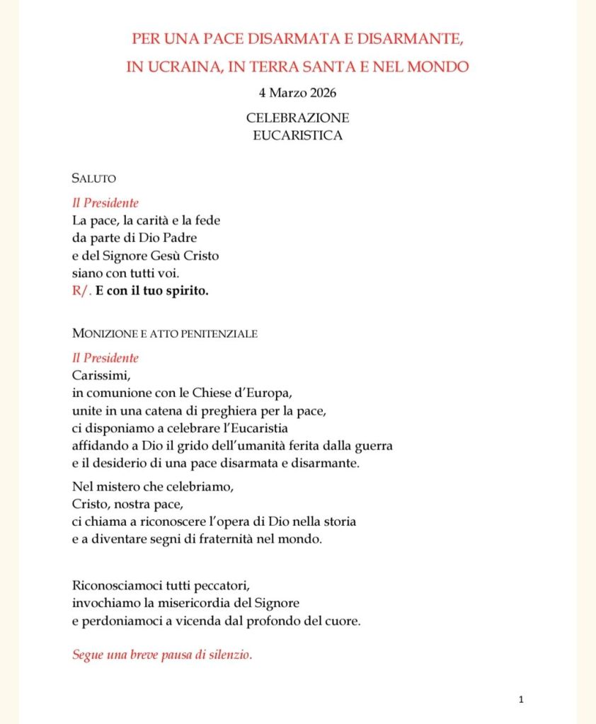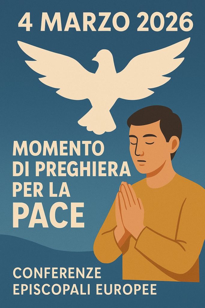 Associazioni amiche, CRISTIANITA', Europa, La domenica di riflessione, ULTIMA ORA, vangelo e letture 4 marzo 2026 Siamo TUTTI invitati alla preghiera per la Pace indetta dalle conferenze Eposcopali Europee Che il Signore illumini la mente dei politici e dei governati di tutto il Mondo Penna Bianca Condividi: Condividi su X (Si apre in una nuova finestra) X Condividi su Facebook (Si apre in una nuova finestra) Facebook Mi piace Caricamento... Correlati