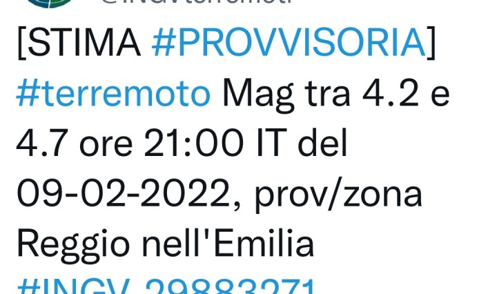 AGGIORNAMENTO TERREMOTO n.1 del 9/02/2022il nostro territorio è stato interessato da due scosse sismiche con epicentro nella bassa reggiana.In questo momento per ragioni di sicurezza l’impianto natatorio è stato chiuso, la Polizia locale ha in servizio tutte pattuglie, per segnalare … Continua a leggere Terremoto a Reggio Emilia e provincia percepita anche a Modena e Carpi
