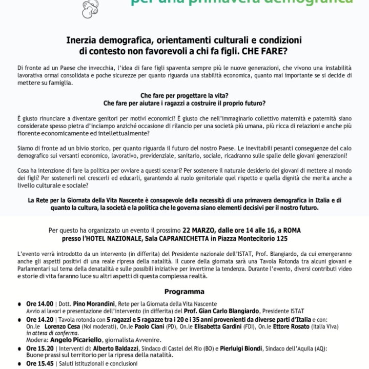 💟 CHE FARE PER PROGETTARE LA VITA? Che fare per aiutare i giovani a costruire il proprio futuro ? 🤔 È giusto rinunciare a diventare genitori … Continua a leggere Mercoledì 22 Giornata per la Vita Nascente a Roma dalle ore 14