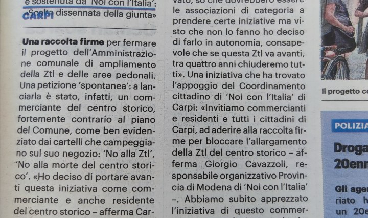 Carpi, Noi con l’Italia in appoggio alla raccolta firme per fermare l’allargamento della ZTL – Noi con chi alza la saracinesca ogni giorno e vuole continuare a lavorare,💪